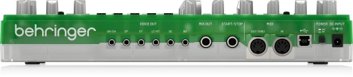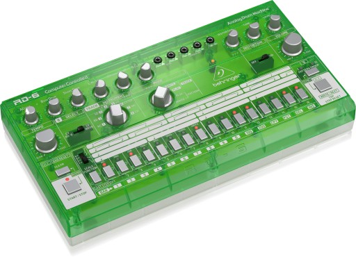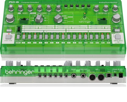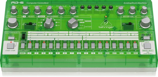 Behringer RD-6-LM klasyczny analogowy automat perkusyjny z 8 brzmieniami perkusyjnymi, 16-to krokowym sekwencerem i efektem distortion, kolor: jasnozielony, obudowa przezroczysta
