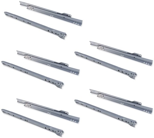 Zestaw 5 par prowadnic / prowadnic rolkowych z częściowym wysuwem do szuflady wykonanych ze stali, malowanych na kolor srebrny RAL9022 . Każdy zestaw pakowany jest indywidualnie.