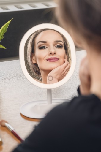 Lusterko wykorzystuje długowieczne, energooszczędne diody LED, których moc możesz regulować w zależności od swoich potrzeb. Duża siła sprawdza się w słoneczny dzień, natomiast mniejsza po zmroku lub w ciemnym pomieszczeniu. Idealnie zbalansowane światło nie razi w oczy, co zdecydowanie ułatwia pracę nad charakteryzacją.