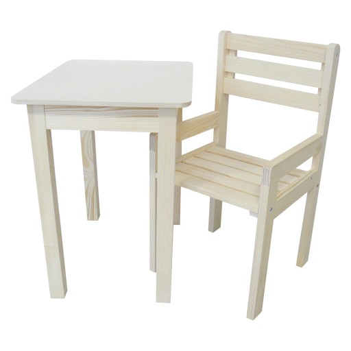 Komplet składa się ze stolika oraz krzesełka. Wykonany został z drewna świerkowego nie pokrytego lakierem. Komplet doskonale uzupełni umeblowanie pokoiku Twojego dziecka sprawi, że jego wnętrze stanie się ciepłe i radosne. Mebelki są funkcjonalne i nie zajmują dużo miejsca. Krzesełko jest bardzo wygodne, a stolik zapewnia wystarczającą ilość miejsca do zabawy. Twoje pociechy odnajdą przy nim doskonałe miejsce do zabawy, rysowania i malowania, a nawet spożywania posiłków.