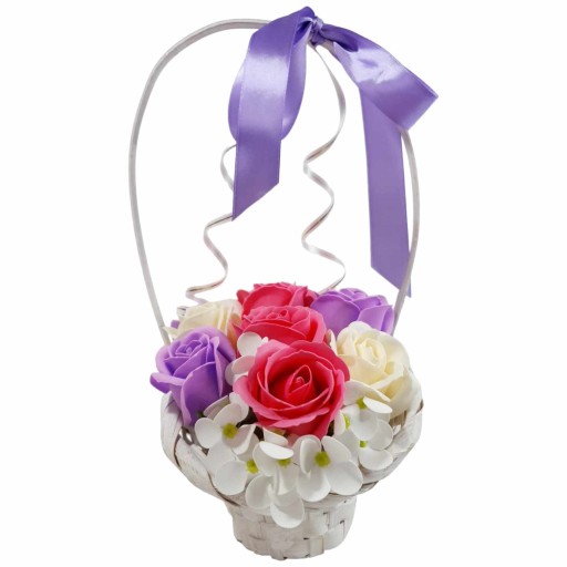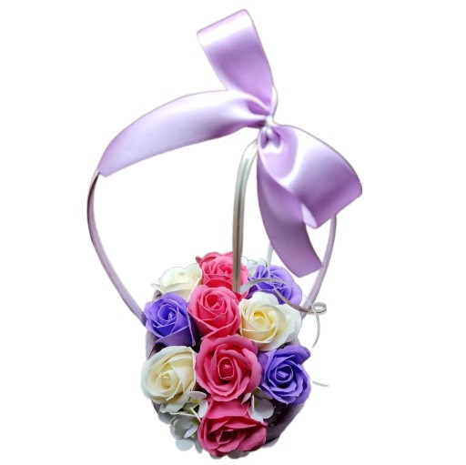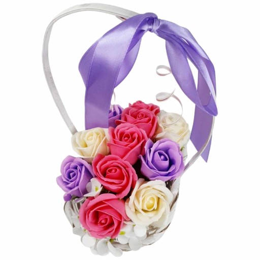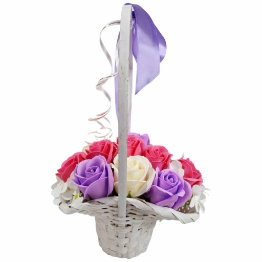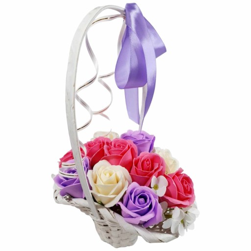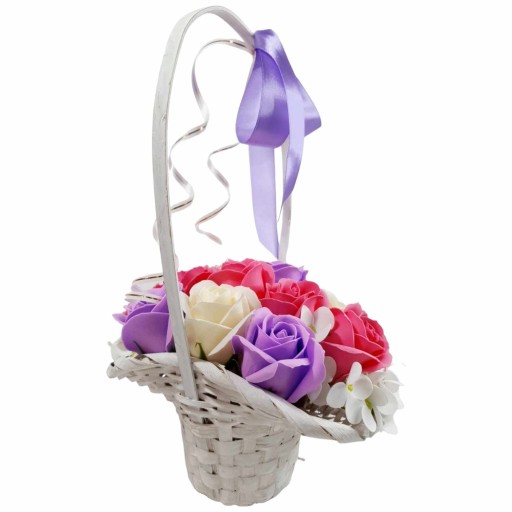 Kosz z różami i innymi kwiatami mydlanymi to idealny prezent dla bliskiej osoby lub piękna ozdoba dla Twojego domu lub biura.