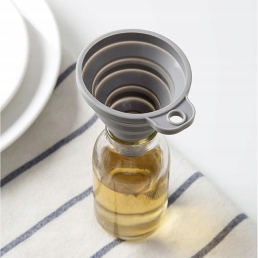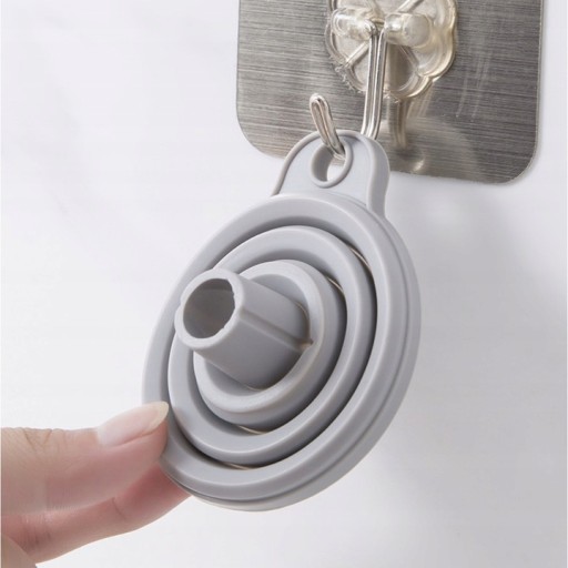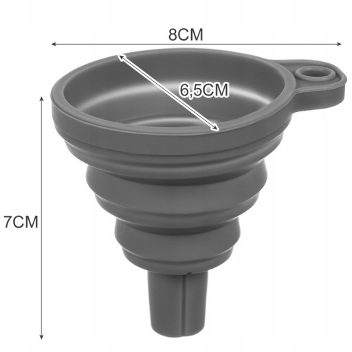 - SPECYFIKACJA - kolor: szary; materiał: silikon; składany: tak; możliwość zawieszenia: tak; wymiary: 7x8cm; średnica wlewu: 6,5cm; średnica wylewu: 1,1cm; waga: 0,02kg; waga w opakowaniu: 0,026kg.