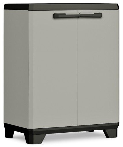 Niska szafka Planet wykonana została z wysokiej jakości tworzywa sztucznego, pochodzącego w 80% z recyklingu. Solidna i wytrzymała konstrukcja osadzona została na masywnych, lekko podwyższonych i regulowanych nóżkach. Wewnątrz szafki umieszczono jedną praktyczną półkę, która wytrzyma nacisk aż do 15 kg. Możliwość zamontowania jej na dowolnej wysokości umożliwia dopasowanie wnętrza szafy pod kątem wielkości i kształtu przechowywanych w niej przedmiotów. Dodatkowym atutem tego modelu są ergonomiczne uchwyty, gwarantujące łatwe otwieranie i zamykanie drzwiczek szafki, do których można zamontować kłódkę. Elegancki i minimalistyczny design w połączeniu ze stonowaną kolorystyką rewelacyjnie wkomponuje się w każdą aranżację.Niska szafa Planet zachwyca niewiarygodnie łatwym montażem. Jest to tańsza seria szaf plastikowych w najlepszej cenie!