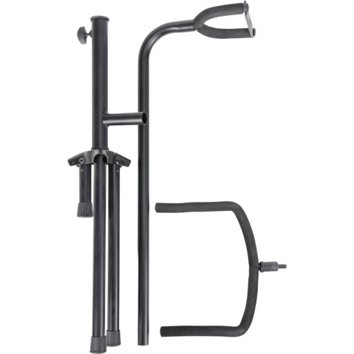 Uniwersalny, czarny stojak gitarowy do gitar akustycznych, basowych i elektrycznych, wyposażony w element zamykający, który zapobiega przewróceniu się gitary
