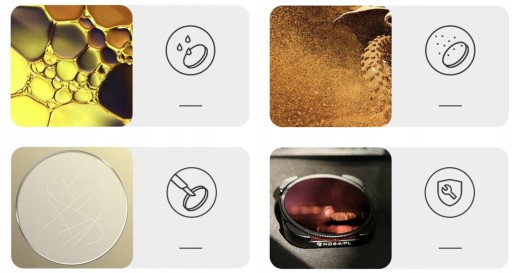 Wielowarstwowe, olejoodporne, odporne na zarysowania i uszkodzenia mechaniczne, chronią kamerę przed odciskami palców, wodą, kurzem.