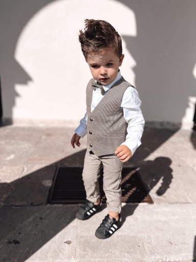 Elegancki komplet dla chłopca został wykonany z przepięknej tkaniny w pepitkę. Materiał ma odcień ciepłego beżu i brązu. Podstawą dla nas jest funkcjonalność, dlatego każdy element zestawu został wykonany tak, aby był dobrze dopasowany i wygodny dla Twojego dziecka. Tkanina jest przyjemna w dotyku oraz łagodna dla skóry dziecka.