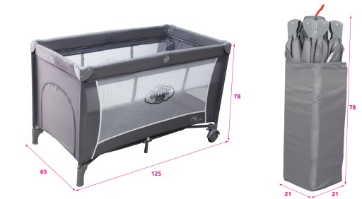 Po złożeniu łóżeczko ma niewielkie wymiary (78 x 21 x 21 cm), dzięki czemu bez problemu zmieści się do bagażnika samochodu. Do łóżeczka dołączona jest praktyczna torba z dwoma mocnymi uchwytami.