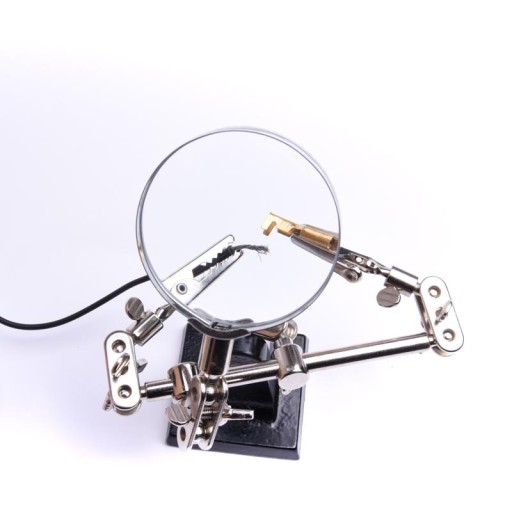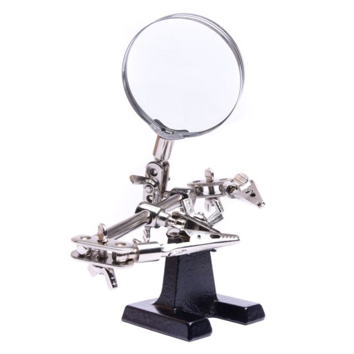 Uchwyt montażowy "trzecia ręka" z regulowaną lupą o średnicy 6cm oraz uchwytami, z regulacją konta nachylenia oraz wysokości lupy oraz uchwytów. Narzędzie jest niezbędnym wyposażeniem warsztatu każdego elektronika, umożliwia swobodną pracę dwóch rąk przy lutowaniu elementów elektronicznych.