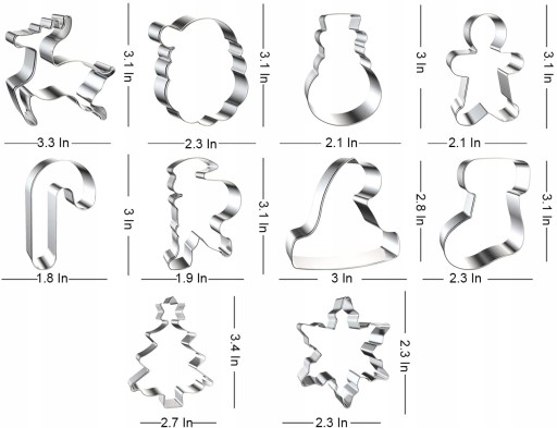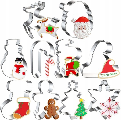 Zestaw foremek do ciastek świątecznych: 10 szt. foremek do ciastek w zestawie: piernikowy ludzik, święty mikołaj, choinka, bałwan, laska cukrowa, renifer i inne kształty do robienia ciastek domowych.