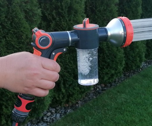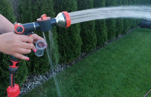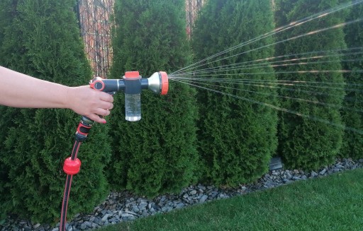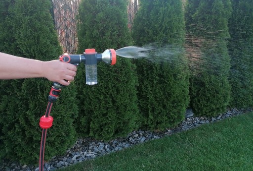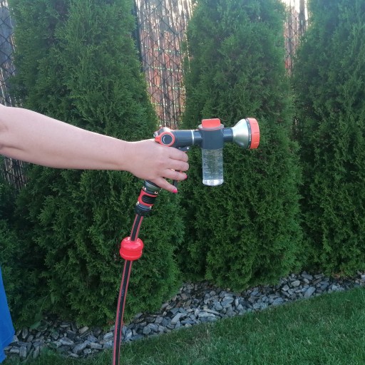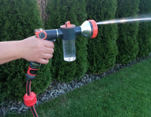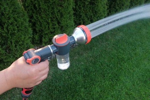Pistolet ogrodowy wielofunkcyjny z dozownikiem to doskonałe rozwiązanie podczas stosowania detergentu lub nawozu płynnego. Naniesiona na dozownik skala ułatwia dawkowanie.