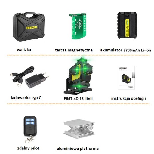 Przedmiotem aukcji jest laser krzyżowy marki Firecore model F95T-4G wraz z zestawem akcesoriów