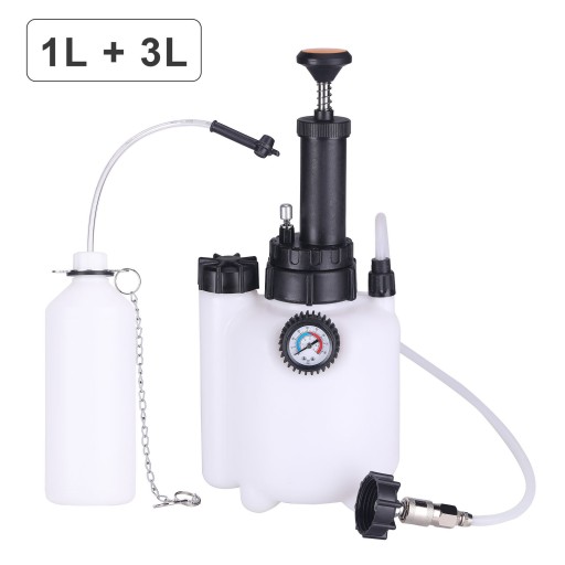 Zestaw pozwala na jednoosobowe wykonanie napełnienia oraz odpowietrzania układu hamulcowego przy pomocy ciśnienia z instalacji pneumatycznej (kompresora).