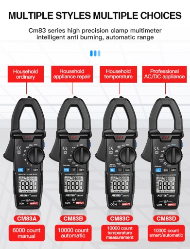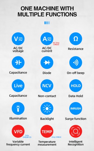 CM83B: auto zakres, 600A AC prąd, pomiar rezystancji (0-10M), ciągłość/dioda, pomiar pojemności, napięcie DC 600V, napięcie AC 600V, NCV bezdotykowe wykrywanie napięcia AC, latarka/podświetlenie cęgowe, data hold, True-RMS, AUTO-LoZ, RCD Kontrola ochrony przed prądem upływowym, pomiar prądu o zmiennej częstotliwości