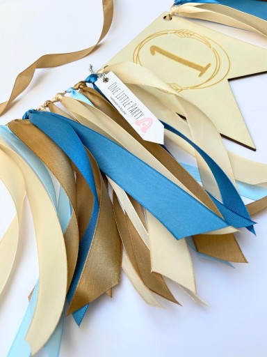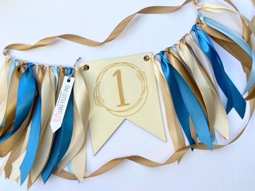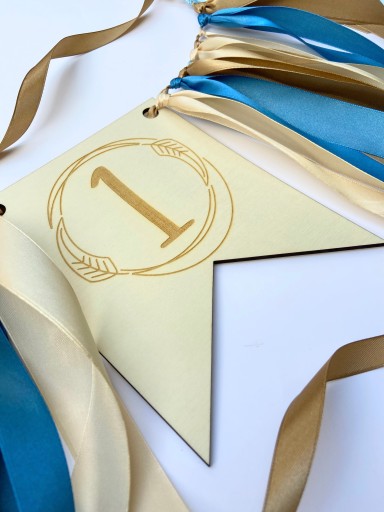 Proporczyk na krzesełko z dowolną cyferką i kolorowymi wstążkami w kolorach niebieskiego, brązu i beżu - ze sklejki drewnianej. Dowolna cyfra do wybrania. Wymiary proporczyka to 14 x 17,5 cm. Nasze drewniane proporczyki są dokładnie takiego samego wymiaru jak te papierowe :)