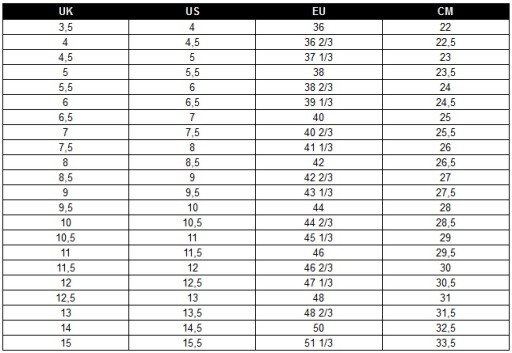 Połóż na podłodze kartkę papieru tak, by jeden jej brzeg przylegał do ściany. Stań na papierze z piętą przy ścianie. Zaznacz ołówkiem miejsce, w którym kończą się Twoje palce. Zmierz na papierze odległość między ścianą, a zaznaczonym przez Ciebie miejscem, a następnie porównaj tę długość z długością w naszej tabeli rozmiarów.