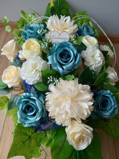 Zamawiasz ogólnie kolorystykę kompozycji, która może lekko się różnić od przedstawionych zdjęć (w razie jakiś braków kwiatków, różnice w siatce, liściach czy kolorach dodatków).