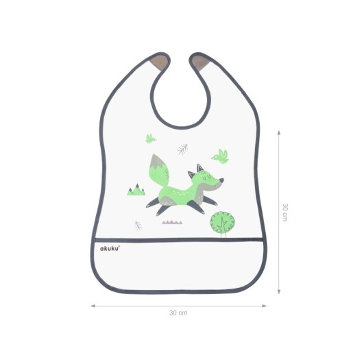 Wyposażony w dużą kieszeń, która zatrzymuje resztki pokarmu. Posiada także wygodne zapięcie na rzep. Łatwy do utrzymania w czystości. Wystarczy zaraz po jedzeniu umyć śliniaczek w ciepłej wodzie z mydłem dla dzieci.