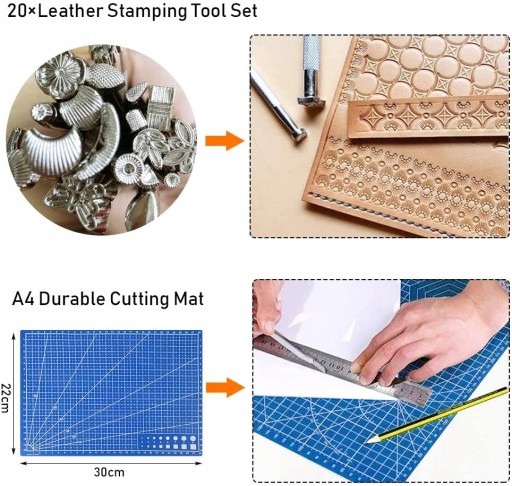 ➤ 103 szt. ZESTAW DO OBRÓBKI SKÓRY --- Opakowanie zawiera 8 szt. zestawu do obróbki skóry, 5 szt. narzędzia do wygładzania skóry, 5 szt. woskowanych nici, 13 szt. zestawu do szycia skóry, 20 szt. zestawu do stemplowania skóry, 50 zestawów zatrzasków i nitów, matę do cięcia A4, torba do przechowywania itp. Narzędzia do obróbki skóry spełnią Twoje potrzeby w zakresie rzemiosła skórzanego.
