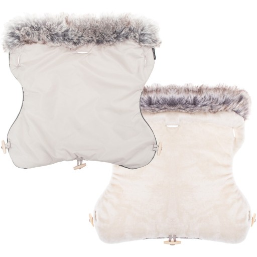 Środek mufki jest wyściełany miłym w dotyku materiałem dla pełnej wygody dłoni rodzica podczas spacerów na świeżym powietrzu. Futerko znajdujące się wokół nie tylko efektownie wygląda, ale także chroni przed zimnem. Zewnętrzny materiał nie wsiąka wody, a wypełnienie materiału utrzymuje ciepło wewnątrz.