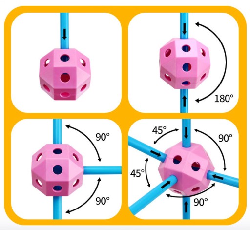 Rurki łączymy ze sobą za pomocą dołączonych do zestawu łączników. Są ich dwa rodzaje, mniejsze krzyżyki umieszczamy na końcach rurek aby tworzyć konstrukcje typu koła. Łączniki o kształcie kostki służą do łączenia długich rurek aby stworzyć np. bazę.