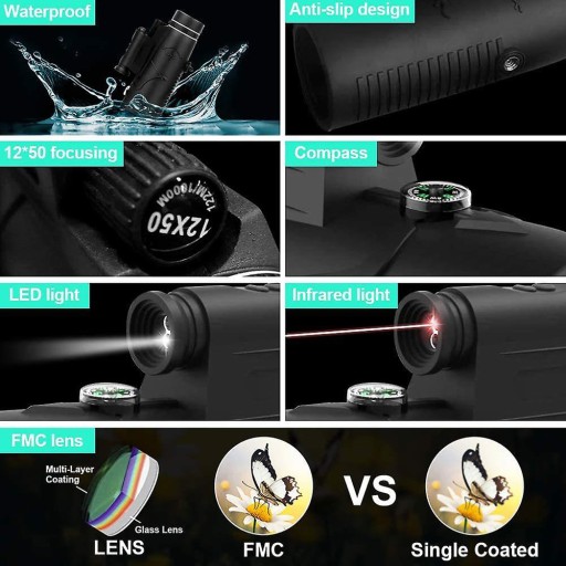 1, Ultra HD - Monokular 12x50 jest wyposażony w szerokokątny obiektyw Ultra HD 50 mm, wyróżniający się i jasny widok krajobrazów. Ciesz się dalekimi widokami podczas eksploracji na świeżym powietrzu. Wyświetla wiele różnic z odległości do 820 stóp.