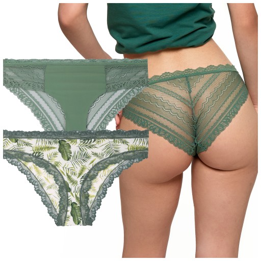 Prezentujemy Ci eleganckie Majtki figi damskie z koronkowym wykończeniem w pakiecie 2 sztuk z kolekcji LIMITED EDITION, zapakowane w piękne ozdobne pudełko. Ten niezwykły zestaw składa się z dwóch różnych wariantów majtek, z których jedna sztuka posiada delikatny wzór roślinny monstery i paproci, podczas gdy druga sztuka jest bez wzoru, jednokolorowa. To absolutna gratka dla miłośniczek ekskluzywnych i wyjątkowych produktów.