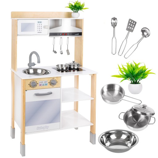 Zestaw ten zachęca do rozwijania umiejętności motorycznych, koordynacji rąk, wyobraźni i rozwiązywania problemów. Kuchnia jest przyjemna w dotyku, brak ostrych krawędzi. Całość wykonana z drewna (drobne plastikowe elementy: uchwyty, kran).