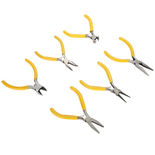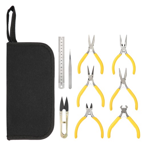1. Obejmuje 9 narzędzi: szczypce płaskie, szczypce tnące, szczypce boczne boczne, szczypce okrągłe, szczypce igłowe, szczypce wygięte, linijka stalowa, pinceta i nożyczki.