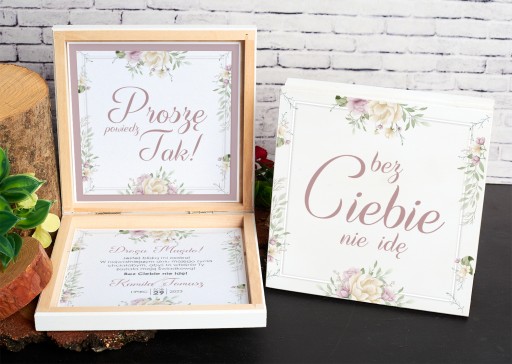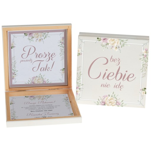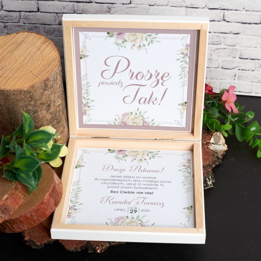 Ślub w życiu człowieka to bardzo ważne wydarzenie, warto w tym dniu mieć przy sobie osobę zaufaną, na którą zawsze można liczyć, idealną świadkową lub świadka. Warto w tym wypadku przygotować niespodziankę przyszłym świadkom i zaskoczyć ich pytaniem w oryginalny sposób! Nasze drewniane pudełeczko z grawerem to najlepszy prezent z prośbą o świadkowanie. To elegancki, stylowy, a jednocześnie niezwykle kreatywny i pomysłowy upominek. Zapewniamy, że będzie miłym zaskoczeniem dla obdarowanego i bez wahania odpowie twierdząco na zadane przez Ciebie pytanie. Szczególnie, że nasz pomysł na prezent z prośbą o świadkowanie ma możliwość personalizacji, co utwierdzi go w wyjątkowości podarunku. Pudełko drewniane - wymiar: 14,5 x 14,5 cm. Kolor pudełka - naturalny lub białym. Wewnątrz zaproszenie na papierze o wysokiej gramaturze.
