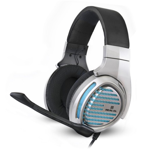 REAL-EL GDX-7670 to nauszne słuchawki stereofoniczne z wbudowanym mikrofonem oraz podświetleniem. Słuchawki wyposażone są w głośniki z membraną o średnicy 50mm, zapewniające wysoką jakość dźwięku. Nauszniki wykonane zostały z miękkiej pianki pokrytej przyjemnym w dotyku materiałem, a regulacja długości słuchawek odbywa się za pomocą dwustronnej regulacji, co zapewnia maksymalny komfort użytkowania, nawet podczas długotrwałego użytkowania. Mikrofon jest wbudowany w ruchomy pałąk, który można podnieść do góry, gdy nie jest potrzebny. Obudowa słuchawek wykonana jest ze srebrnego, solidnego plastiku z wbudowanym podświetleniem, co dodaje im niepowtarzalnego stylu.