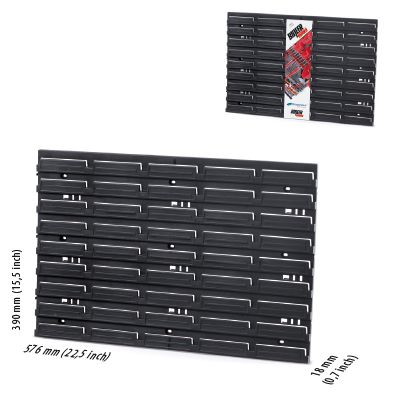 Duża, idealna do pojemników NP, NPKL Trwała i wytrzymała Wykonana z wysokiej jakości materiału Otwory umożliwiające mocowanie do ściany (9 szt.) Wymiary tablicy: długość 57,6 cm wysokość 39 cm grubość 1,8 cm Możliwość poziomego łączenia tablic dzięki wypustkom Możliwość zawieszenia pojemników z serii NP oraz NPKL firmy Prosperplast Kolor: czarna