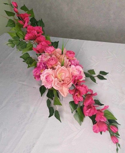 Wiązanka nagrobna wykonana ręcznie z wysokiej jakości sztucznych kwiatów w donicy zalanej betonem.