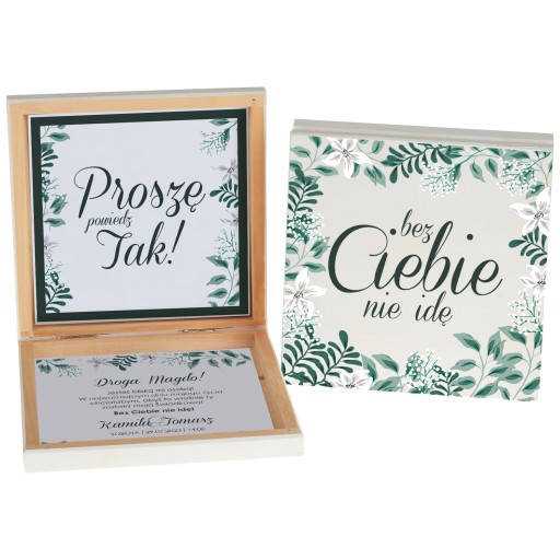 Ślub w życiu człowieka to bardzo ważne wydarzenie, warto w tym dniu mieć przy sobie osobę zaufaną, na którą zawsze można liczyć, idealną świadkową lub świadka. Warto w tym wypadku przygotować niespodziankę przyszłym świadkom i zaskoczyć ich pytaniem w oryginalny sposób! Nasze drewniane pudełeczko z grawerem to najlepszy prezent z prośbą o świadkowanie. To elegancki, stylowy, a jednocześnie niezwykle kreatywny i pomysłowy upominek. Zapewniamy, że będzie miłym zaskoczeniem dla obdarowanego i bez wahania odpowie twierdząco na zadane przez Ciebie pytanie. Szczególnie, że nasz pomysł na prezent z prośbą o świadkowanie ma możliwość personalizacji, co utwierdzi go w wyjątkowości podarunku. Pudełko drewniane - wymiar: 14,5 x 14,5 cm. Kolor pudełka - naturalny lub białym. Wewnątrz zaproszenie na papierze o wysokiej gramaturze.