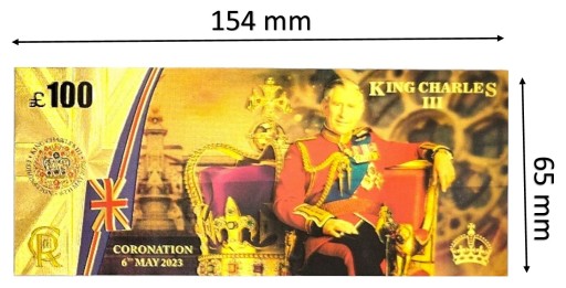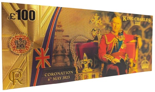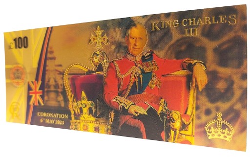 Fantazyjny banknot z wizerunkiem króla Karola III wydany z okazji jego koronacji 6 maja 2023 roku. Karol III i jego małżonka Kamila zostali koronowani na króla i królową Zjednoczonego Królestwa podczas ceremonii w Opactwie Westminsterskim, będącej 40. tego typu uroczystością w historii Opactwa.