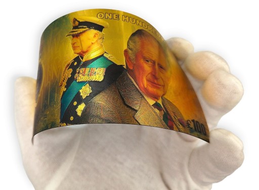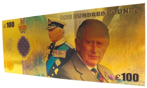 Piękny pozłacany kolekcjonerski 100 funtowy banknot z wizerunkiem Króla Karola III.