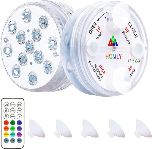 To podwodne oświetlenie zasilane jest 3 bateriami AAA (brak w zestawie, działa 10-12 godzin z kwalifikowanymi suchymi bateriami), 16 różnych trybów statycznych, 4 tryby dynamicznej zmiany kolorów. Zanurzalne, zasilane bateryjnie, pilot na podczerwień, ściemnianie i włączanie/wyłączanie. (Wskazówka: pilot nie jest wodoodporny, należy trzymać go z dala od wody)