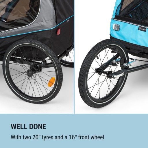 - 2 w 1: nieskomplikowana przebudowa na wózek dziecięcy do pchania podczas joggingu (jogger) dzięki dodatkowemu kołu przedniemu i rozkładanemu uchwytowi do pchania z odrębnym hamulcem