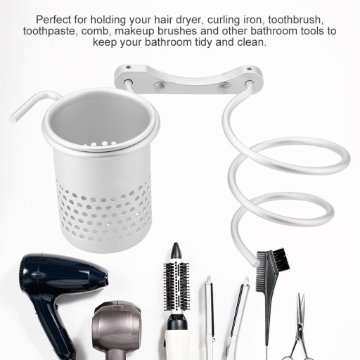 • Ten uchwyt na suszarkę do włosów, który jest wykonany z wysokiej jakości kosmicznego materiału aluminiowego, może pomieścić suszarkę do włosów, lokówkę, szczoteczkę do zębów, pastę do zębów, grzebień, pędzle do makijażu i inne narzędzia łazienkowe, aby utrzymać porządek i czystość w łazience. Spiralne, modne i minimalistyczne elementy pasujące do każdego stylu urządzania łazienki.