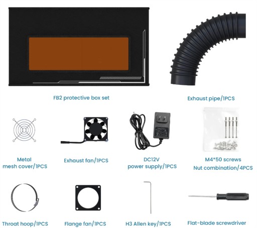 Obudowa lasera ATOMSTACK MAKER FB2 Plus ma zastosowanie w systemie bezprzewodowym bez instalacji, która może być montowana w ciągu trzech minut od odbioru oraz szybko zdemontować i rozproszone. Rura spalinowa może zostać skrócona do długości 50 cm i rozciągnięta do długości 2 m.