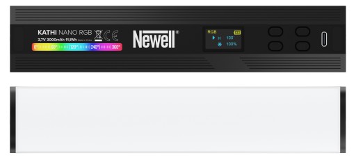 Lekka obudowa urządzenia zapewnia odpowiedni komfort i wygodę pracy ze światłem. Dwa żeńskie gwinty 1/4" ułatwiają montaż na statywie, a mocne magnesy umożliwiają "przyklejanie" do metalowych powierzchni. Sześciokątna obudowa pozwala ustawić lampę Newell RGB Kathi Nano na płaskiej powierzchni w pięciu różnych pozycjach.