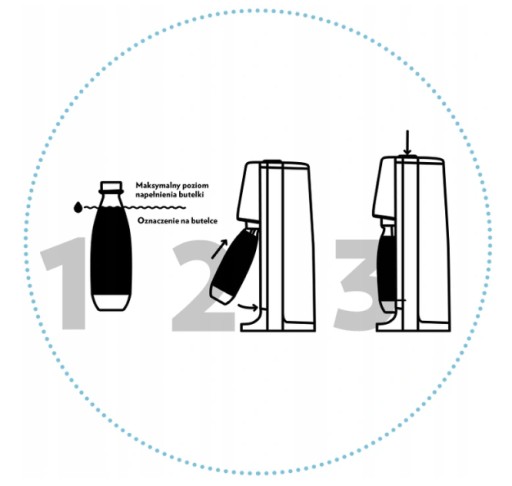 - Nalej schłodzoną wodę do butelki SodaStream nieprzekraczając poziomu wyznaczonego przez linię na butelce.