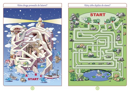 Labirynty to łamigłówki świetnie rozwijające umysł i wyobraźnię najmłodszych. Znalezienie właściwej drogi wśród poplątanych ścieżek to nie lada wyzwanie, wymagające skupienia, koncentracji i spostrzegawczości. Czasem dzieci będą musiały wydostać się z pułapki mniej lub bardziej skomplikowanych korytarzy, a niekiedy odkryć, która z dróg prowadzi do celu. W każdym z labiryntów czeka je mnóstwo zabawy i wrażeń, a kolorowe grafiki umilą czas spędzony z książeczką.