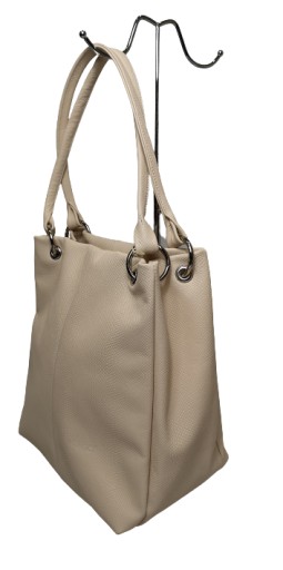 Praktyczność w pięknym wydaniu. Damska torebka typu worek ze skóry w kolorze ecru. Projekt o prostokątnym kształcie i stabilnym dnie, wyposażony w długie rączki wygodne do noszenia w dłoni oraz na ramieniu.Z tyłu duża zasuwana kieszeń na podręczne drobiazgi. Cztery metalowe koluszka nadają całości praktycznego wyglądu. Wnętrze wykończone podszewką, model posiada w środku organizer na karty i wizytówki, specjalne miejsce na telefon komórkowy oraz zasuwaną kieszonkę. Torebka z pewnością zostanie doceniona na spotkaniu towarzyskim oraz sprawdzi się podczas dnia w pracy. Świetnie nadaje się dla kobiet potrzebujących przestrzeni na niezbędne przedmioty.
