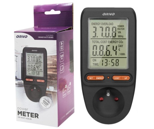 Watomierz umożliwia nam sprawdzenie zużycia prądu elektrycznego i obliczenie kosztów zużytej energii podłączonego urządzenia. Duży wyświetlacz LCD pokazuje dodatkowo: napięcie sieci, prąd w obwodzie, częstotliwość prądu, współczynnik mocy POWER FACTOR, moc podłączonego obciążenia, całkowite zużycie energii kWh, koszt zużytej energii, programowalną cenę 1kWh, łączny czas pomiaru zużycia energii od 0 sek. do 9999 dni, uśrednioną wagę emisji CO2 przy wytworzeniu energii pobranej. Pomiar napięcia: 150V~ 276V~.