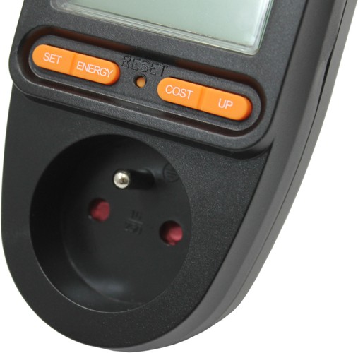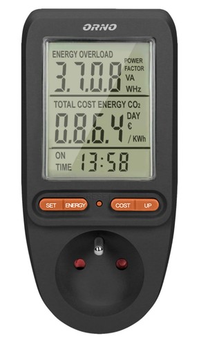 - Duży wyświetlacz LCD pokazuje dodatkowo napięcie, prąd, częstotliwość, współczynnik mocy POWER FACTOR, moc podłączonego urządzenia, całkowite zużycie energii kWh, koszt zużytej energii, programowalną cenę 1kWh, łączny czas pomiaru zużycia energii od 0 sek. do 9999 dni, uśrednioną wagę emisji CO2 przy wytworzeniu energii pobranej