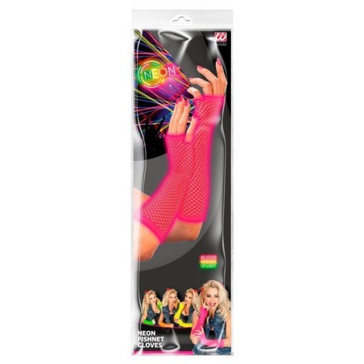 Neonowe rękawiczki z siatki w kolorze różowym. Długość - ok. 33 cm. Bez palców.