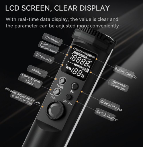 Ergonomiczna konstrukcja panelu kontrolnego bazującego na wyraźnym ekranie LCD, przyciskach i specjalnym pokrętle pozwala szybko i wygodnie zmieniać ustawienia światła. W zestawie z lampą znajdziesz specjalny uchwyt montażowy kompatybilny z gwintem 1/4". Przezroczysta obejma umożliwi wygodną instalację, bez ryzyka, że jakiś fragment świetlnej tuby zostanie zasłonięty. Uchwyt wyposażono w przegub pozwalający pochylić lampę i precyzyjnie dostosować jej ustawienie do bieżących potrzeb.