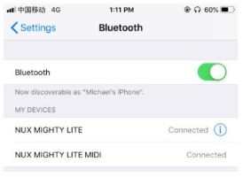 4. Wróć do ustawień Bluetooth w telefonie, teraz powinny być dwa urządzenia: NUX Mighty Lite i NUX Mighty Lite Midi, tak jak na zdjęciu.