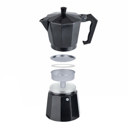 Duża kawiarka wykonana z trwałego aluminium, dzięki czemu jest lekka i wytrzymała. Uchwyt wykonany z tworzywa - zapobiega poparzeniu się.