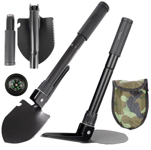 - 6 w 1: łopatka, kilof, motyka, piła, otwieracz do butelek/puszek, kompas